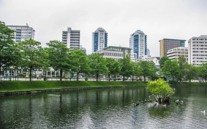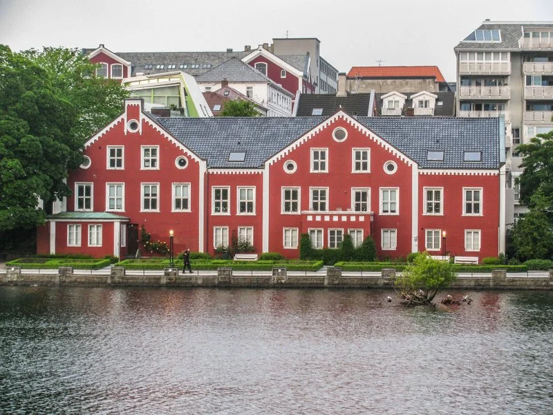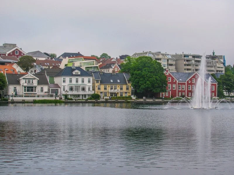 Наше знакомство со Ставангером начиналось и заканчивалось на автобусном терминале, который по счастливому совпадению расположен на берегах озера Брейяватнет (Breiavatnet). Почему совпадение счастливое? Потому что Брейяватнет по праву может считаться сердцем Ставангера и один из немногих зеленых островков в центре. На этапе подготовки к поездке мы даже подумывали о том, а не поставить ли нам палатку в парке вокруг Брейяватнет, если не успеем до кемпинга. Но уже тогда мы поняли, что эта идея обречена на провал :) Вокруг озера тесным кольцом расположены старинные постройки, которые сейчас приведены в идеальное состояние и служат в качестве магазинов или ресторанов и вокруг толпится масса народа с любое время суток.