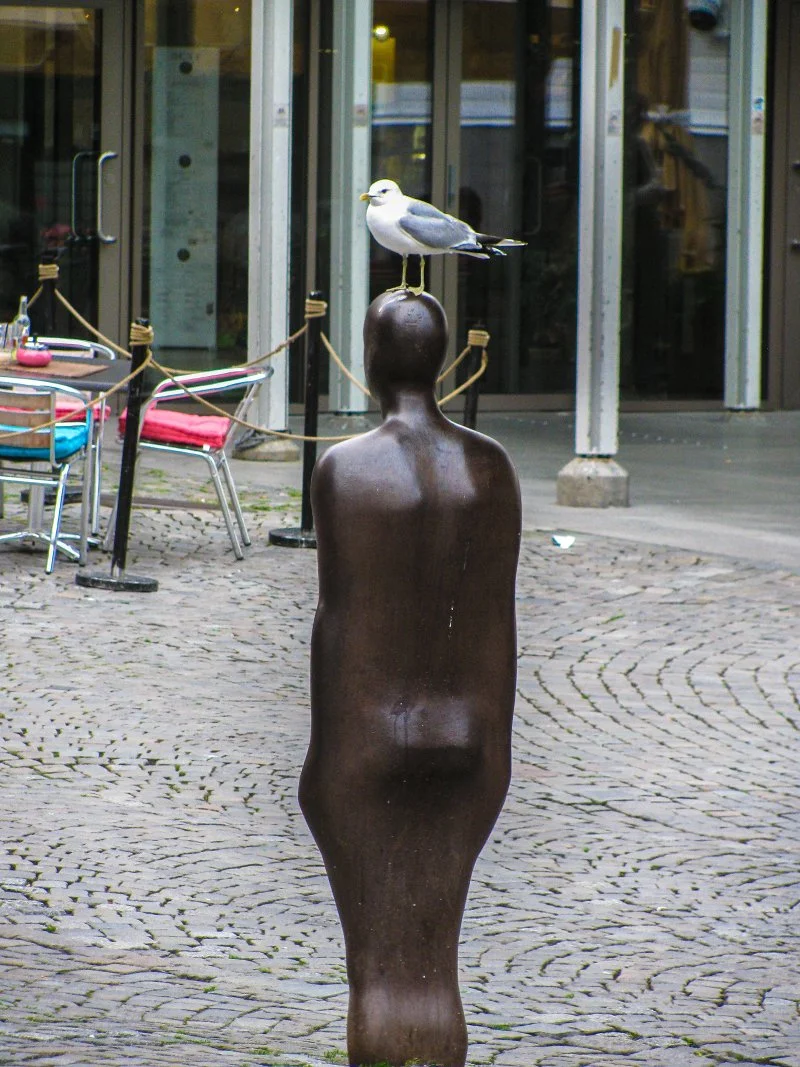 На мой взгляд, самые необычные памятники Ставангера – это чугунные человеческие фигуры, расставленные в, на первый взгляд, хаотическом порядке по всему городу. Одну из низ мы встретили по пути из кемпинга в центр, а вот эта стоит у входа в McDonalds.