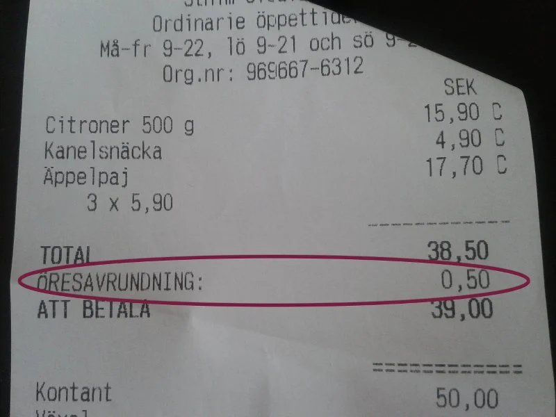 Дело в том, что эре осталось в указании цен, вот только вместо милых монеток на сдачу в чеке укажут экзотическое слово “öresavrudning” - “округление эре” и плюс-минус несколько эре.