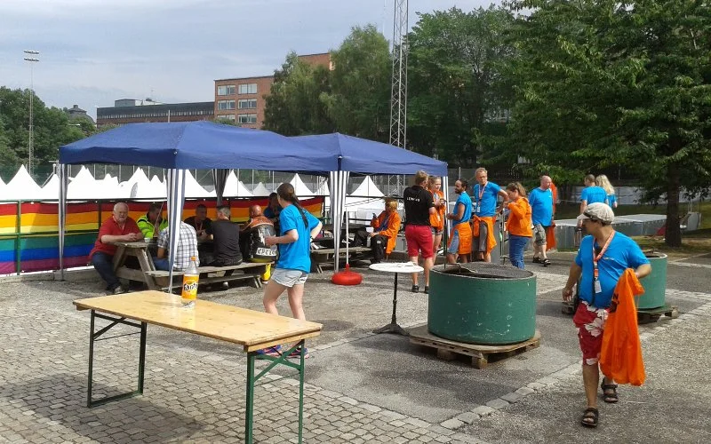 Прайд-Парк находится на территории Стокгольмского ипподрома. Внизу палатки, а на площадке сверху – зона для нас, волонтёров. Тут мы собираемся, перекусываем, болтаем, получаем ценные указания.