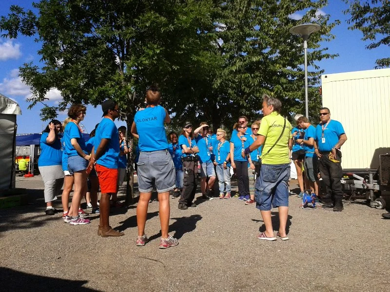 Есть своя “скорая помощь”. Это ребята с медицинским образованием, которые следят, чтоб волонтёры хорошо себя чувствовали физически. Они ходят в служебных жилетках, с рациями и рюкзаком-аптечкой. Обычно в жаркие дни их основная работа в том, чтоб проконтролировать, чтоб все пили достаточно жидкости. Вот поймала Кристиана в момент, когда он отчитывал волонтёра, собирающегося идти работать без бутылки воды.