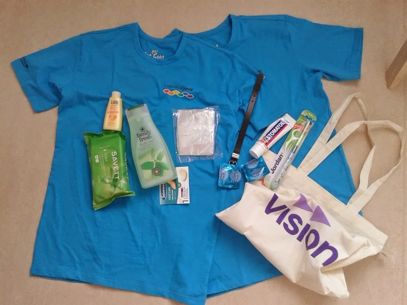 Все волонтеры получают сумку с набором от спонсоров. Её выдали всем волонтёрам во время обучения перед началом работы. В комплект входят 2 форменные футболки, сама сумка, дождевик, пластырь, влажные салфетки, и прочее не совсем необходимое добро от других спонсоров.